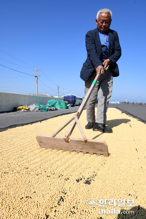 1일 제주시 구좌읍 평대리의 한 공한지에서 인근에 거주하는 농민이 갓 수확을 마친 콩을 가을볕에 말리고 있다. 강희만기자