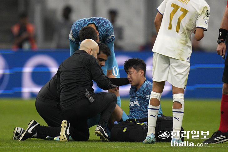 2일(한국시간) 2022-2023시즌 유럽축구연맹(UEFA) 챔피언스리그(UCL) 조별리그 D조 최종 6차전 원정 경기에서 부상으로 쓰러진 손흥민. 연합뉴스