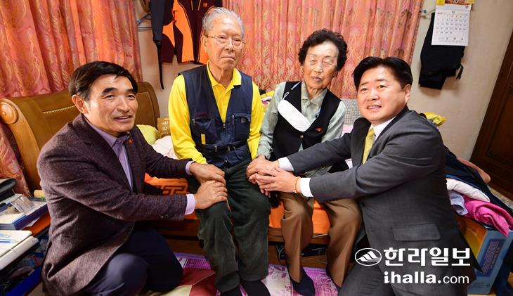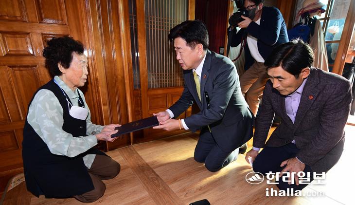 오영훈 제주지사가 2일 오후 제주시 도련동 4·3희생자 유족인 김용례씨 자택을 찾아 '4·3희생자 보상금 지급 결정 통지서'를 전달했다.
