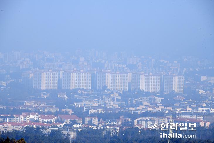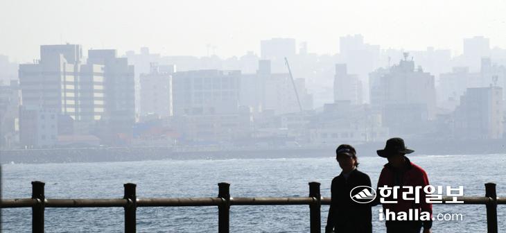 초미세먼지 나쁨을 보인 2일 제주시 용담해안도로에서 바라본 제주시가지가 뿌옇게 보이고 있다. 강희만기자
