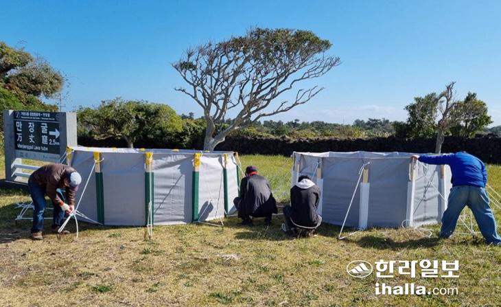 제주시 구좌읍 직원들이 지난 2일 가뭄 취약 지구에 공공용 물백을 설치하고 있다. 사진=구좌읍