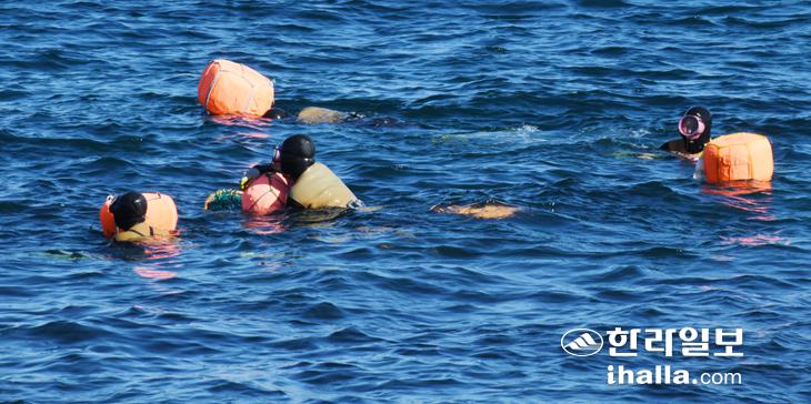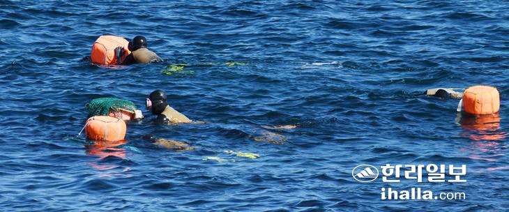 전형적인 가을 날씨가 이어진 3일 제주시 애월읍 해안도로변 해안에서 해녀들이 물질 작업을 하고 있다. 강희만기자