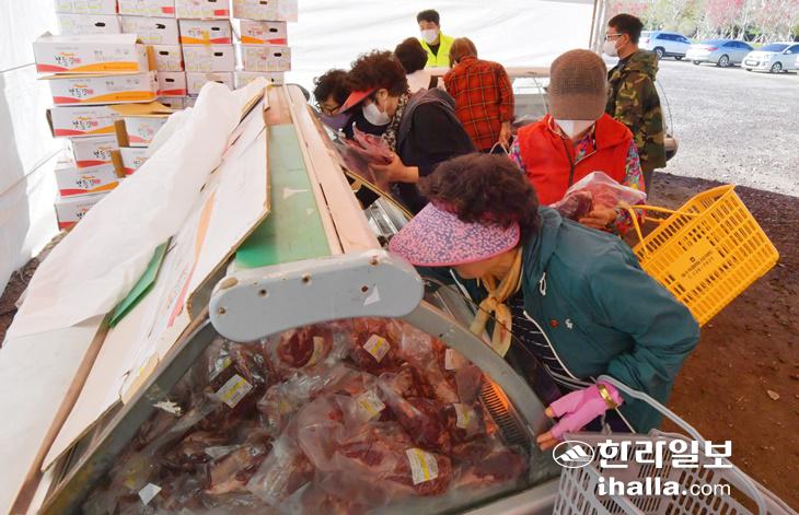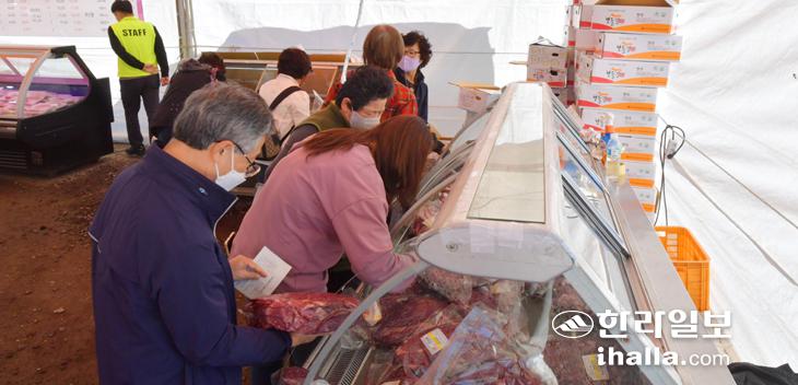 3일 제주시민복지타운에서 열린 제주한우 할인행사장을 찾은 시민들이 한우를 구입하고 있다. 이상국기자