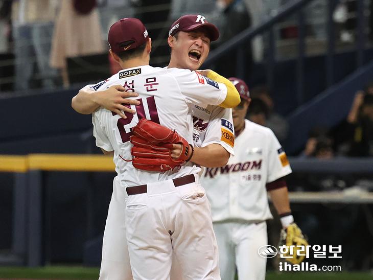 5일 서울 고척스카이돔에서 열린 2022 프로야구 포스트시즌 한국시리즈 4차전 SSG 랜더스와 키움 히어로즈의 경기. 키움 투수 최원태와 송성문이 승리를 거둔 뒤 포옹하고 있다. 연합뉴스