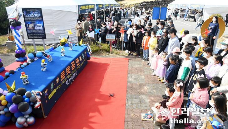 5일 서귀포천문과학문화관에서 열린 '2022 서귀포과학문화축전'을 찾은 어린이들이 로봇공연을 신기한듯 보고 있다. 강희만기자