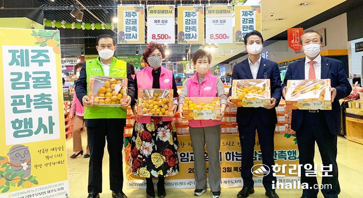 농협제주지역본부(본부장 강승표)는 지난 3일 농협경남지역본부에서 고향주부모임제주도지회(회장 오옥성)와 경남도지회(회장 권순옥)가 지역농산물 소비 확대를 위한 업무협약을 체결했다고 7일 밝혔다. 또 협약에 이어 남창원농협 농수산물종합유통센터에서 농산물 소비촉진과 감귤 홍보의 일환으로 제주감귤판촉행사를 실시, 풋귤청과 감귤 시식코너를 선보였다.