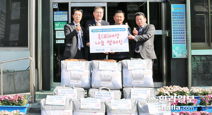 한라신협(이사장 강정신)은 7일 지역 소외계층이 따뜻한 겨울을 지낼 수 있도록 작년에 이어 올해도 제주시 이도1동주민센터(동장 양경원)와 연동주민센터(동장 김윤철)에 각각 이불 10채를 기탁하는 '온 세상 나눔 캠페인'을 전개했다. 강정신 이사장은 "앞으로도 지역사회에 밝은 햇살을 비추는 다양한 나눔 활동을 지속적으로 펼쳐 나가겠다"고 말했다.