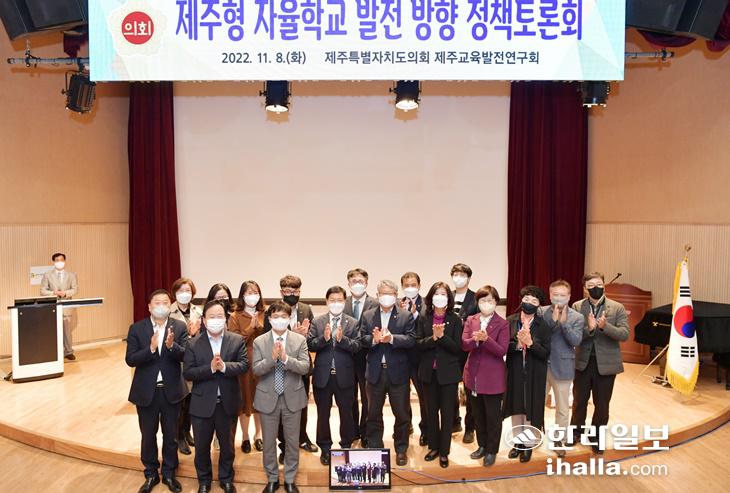 제주도의회 제주교육발전연구회가 주최한 제주형 자율학교 발전 방향 정책토론회 주제발표에 앞서 발표자, 토론자, 행사 관계자 등이 기념촬영을 하고 있다. 사진=제주도의회