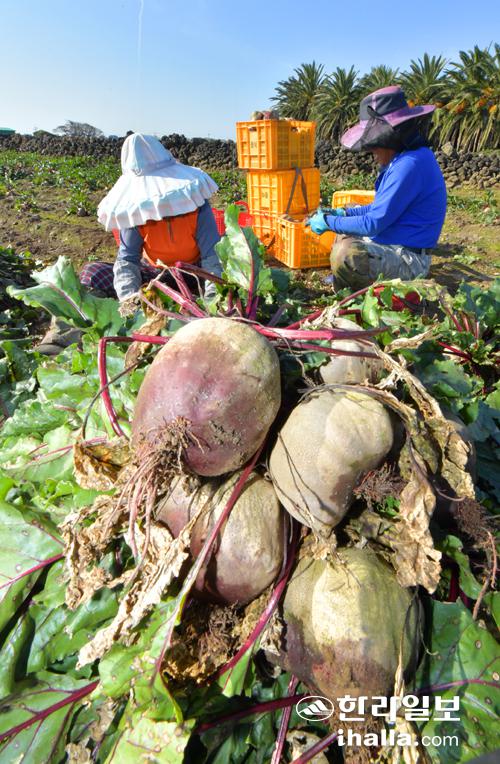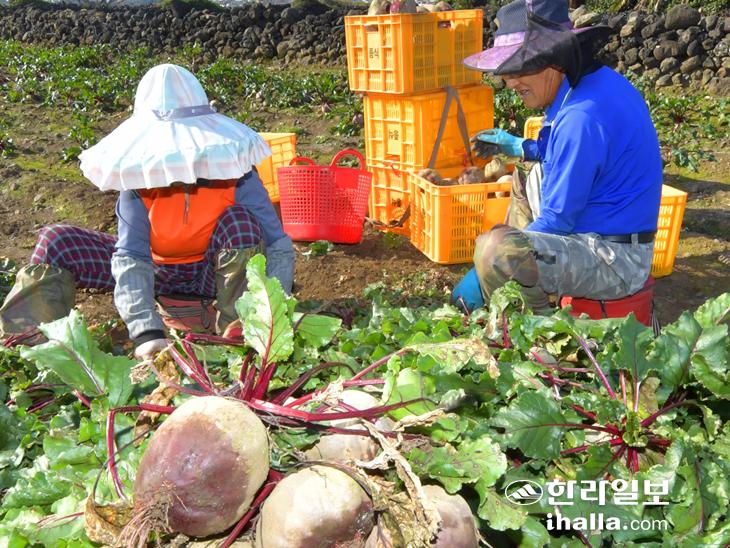 9일 제주시 애월읍의 한 밭에서 농민들이 비트를 수확하고 있다. 이상국기자