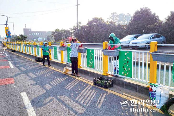 제주시 구좌읍(읍장 고재완)에서는 지난 8일 생활환경팀 직원과 도로변 꽃길 조성 인력 등이 참여해 관내 일주도로변 꽃길 조성에 나섰다. 이날 지역주민과 차량 통행이 잦은 주요 도로변 화단에 계절화인 비올라를 심었고 하도초등학교 난간에 화분을 설치했다.