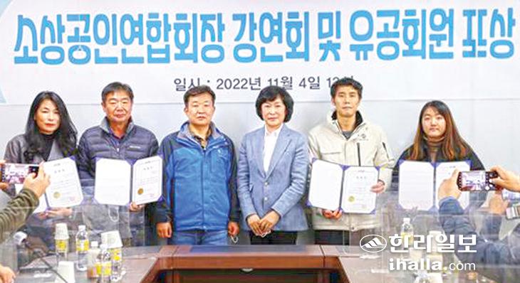 제주특별자치도 소상공인연합회는 소상공인의날(11월 5일)을 맞아 도내 소상공인들을 위해 공헌한 강동우 연동상가회 부회장, 김현구 서귀포시 정방동상가번영회장, 오주연 도소상공인연합회 사무국장, 신인지 도소상공인연합회 주임 등 4명에게 소상공인연합회장 상을 전달했다고 9일 밝혔다.