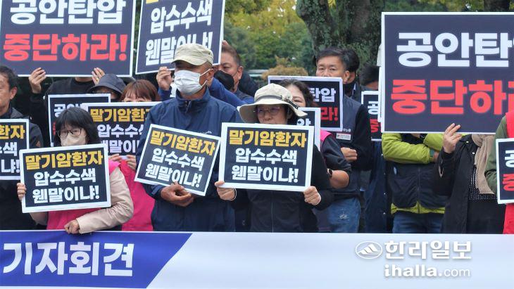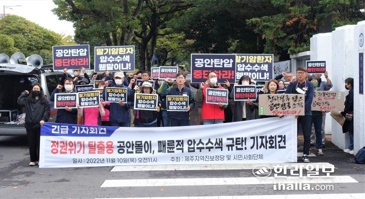 제주 지역 26개 진보 정당과 시민사회단체는 10일 제주경찰청 앞에서 공동 기자회견을 열고 "정권 위기탈출용 공안몰이 패륜적 압수수색 만행을 강력히 규탄한다"고 말했다.