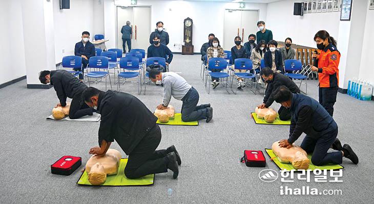 이번 교육은 제주소방서 소방관을 강사로 초빙해 심정지 환자 발생 등 응급상황시 대처할 수 있는 능력을 함양하기 위한 목적으로 추진됐다. 교육 내용은 ▷응급의료체계 소개 ▷응급환자 유형 파악·대처 ▷심폐소생술 중요성 이해·정확한 흉부압박법 습득 ▷자동심장충격기 사용 목적 이해·실습 등이 진행됐다.