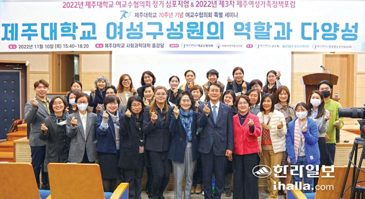 제주대학교 여교수협의회(회장 정유남)는 지난 10일 사회과학대학 중강당에서 제주여성가족연구원(원장 민무숙)과 함께 '제주대 여성구성원의 역할과 다양성'을 주제로 개교 70주년 기념 특별 세미나를 개최했다. 이날에는 1·2부로 나눠 마련된 주제발표와 토론 을 통해 제주의 대학사회 성평등과 다양성에 대한 여러 의견이 오갔다.