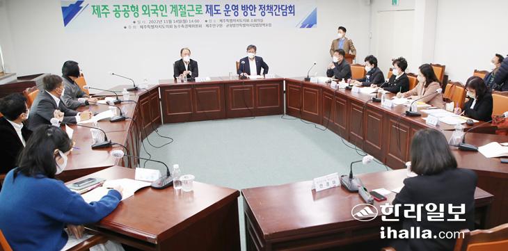 제주특별자치도의회 농수축경제위원회와 균형발전 특별자치 입법정책 포럼 의원 연구모임, 제주연구원은 14일 도의회 소회의실에서 '제주 공공형 외국인계절근로제도 도입 필요성 및 운영과제'에 대한 정책간담회를 개최했다. 제주자치도의회 제공