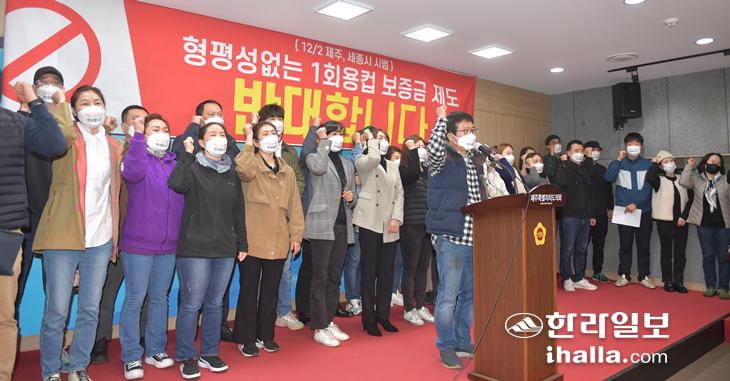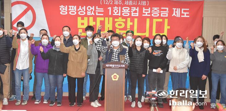 (가칭)제주프랜차이즈협의회 점주들은 14일 제주도의회 도민카페에서 기자회견을 열고 일회용품 보증금제 시행에 대해 반대 입장을 피력하고 있다. 이상국기자