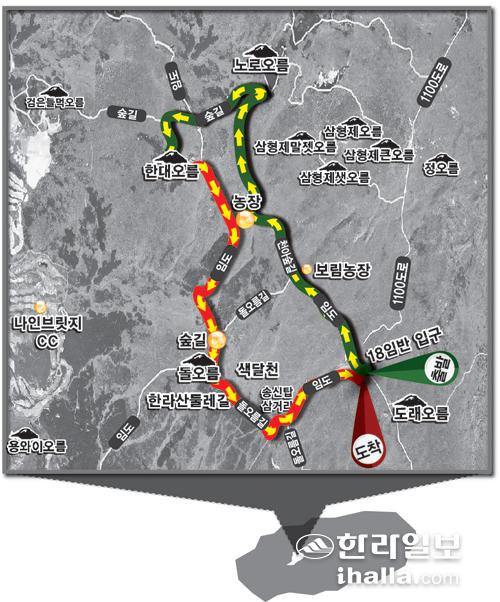 한라산 영실 입구 다래오름 건너편에 18임반 입구가 있다. 임반이란 산림의 위치와 넓이를 표시하여 산림사업실행이 편리하도록 구획한 단위를 말한다. 임반을 관리하기 위해 한라산 서쪽 자락 돌오름, 한대오름, 노로오름 주변은 국유 임도가 연결되어 있다. 임도 사이사이에는 숲길이 거미줄처럼 이어져 있다. 임도를 따라 한라산둘레길인 돌오름길과 천아숲길도 있어 많은 사람이 즐겨 찾는 곳이다.