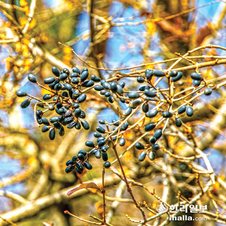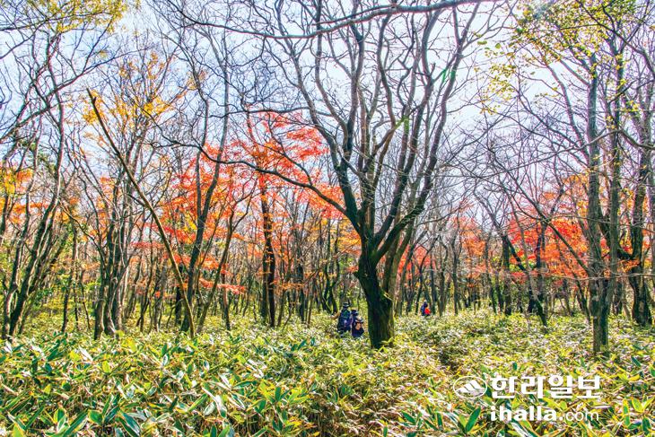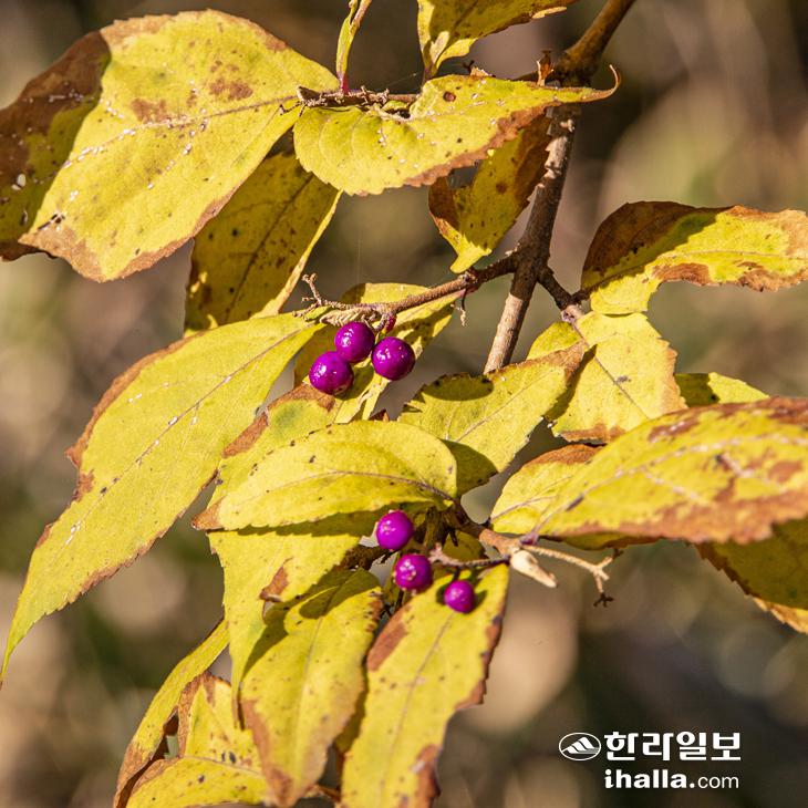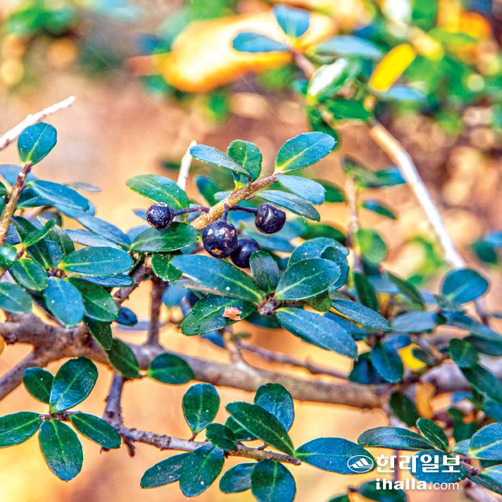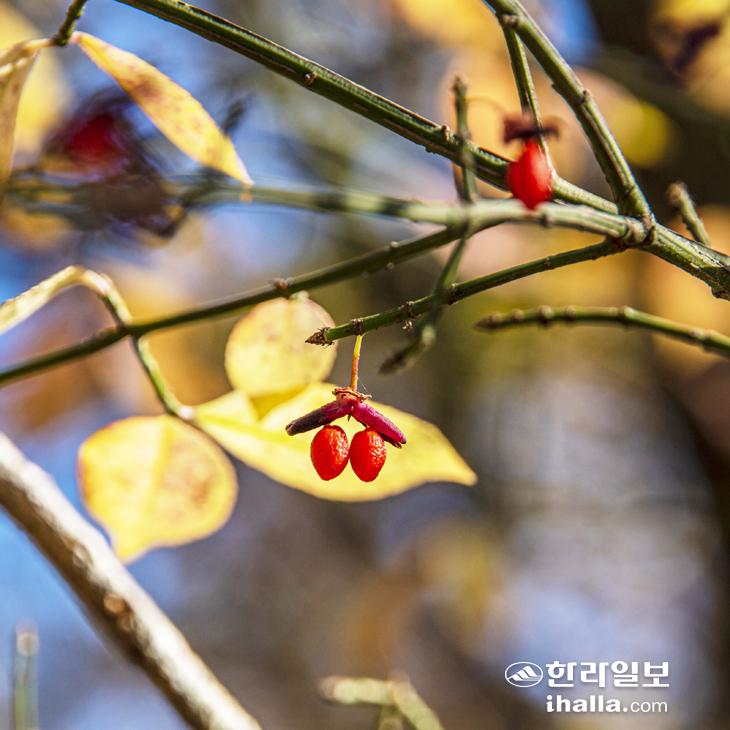 [한라일보] 아직 찬바람이 들어서지 않은 숲길은 포근하다. 포장된 임도 위로 떨어진 낙엽이 가득하고, 조릿대 가득한 숲에는 군데군데 아직도 놓지 않은 빨간 단풍이 눈부시다. 잎을 떨구고 가지만 남긴 나무와 푸른 잎을 가진 나무는 막바지로 접어든 가을 산에 떠나는 자와 남는 자가 되었다. 같은 듯 다른 초록의 풍경들이 단풍보다 더욱 다가오는 늦가을의 숲을 걷는다.