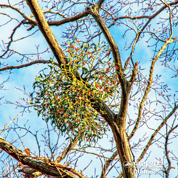 오름을 내리면 살짝 군락을 이루는 억새밭 너머로 삼형제오름이 보이고 그 너머로 백록담이 고개를 내밀고 있다. 길가에는 용담이 꽃을 거두고 열매를 키우고 있다. 삼나무 조림지와 숲길을 지나 돌오름 등산로를 따라 능선을 넘으면 다시 둘레길을 만난다. 정자 쉼터에서 숨을 돌리고 다시 길을 나서 출발지로 향한다. 잎을 떨군 나무와 붉게 물든 단풍과 푸른 잎을 고집하는 나무가 서로의 빈 곳을 채워주는 늦가을의 숲길은 파란 하늘만큼이나 상큼하다. 겨우살이의 빨간 열매가 우리를 내려보고 있다. 양영태 제주여행작가