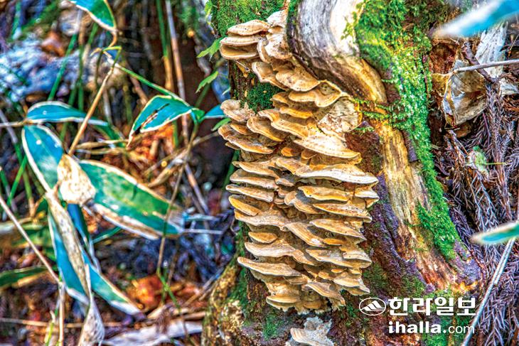 낙엽수가 주종을 이루는 숲은 가을의 끝자락을 달리고 있다. 주황색으로 물드는 참나무류는 어느새 잎을 떨구어 겨울 채비를 마쳤고, 말라버리거나 빨간 잎을 달고 있는 단풍나무가 어우러져 아직은 가을이라고 외치고 있다. 나뭇잎 가득 쌓여 있는 숲길을 걷노라면 붉은 양탄자 위를 걷는 느낌이다. 실개천을 지나고 조릿대 숲을 지나치면 빨간 열매를 다정히 두 개씩 달고 있는 화살나무가 반긴다. 숲길은 표고 재배장으로 가는 길과 둘레길, 임도 등 여러 갈래가 만나고 헤어지기를 반복한다. 한대오름 방향의 숲길로 들어서니 늙은 나무의 줄기에 이끼를 벗 삼아 버섯이 튼튼이 붙어있다. 한겨울에도 싱싱한 주목, 굴거리나무가 그 진가를 드러내는 숲길은 발밑에 바스락거리는 낙엽과 그에 질세라 허리를 감싸는 조릿대의 재잘거림이 귀를 간지럽힌다. 나무를 힘차게 붙잡고 올라가 있는 줄사철나무도 예쁜 열매를 달고 있다. 가을은 결실의 계절이다. 급할 게 없는 걸음으로 한대오름을 향한다.
