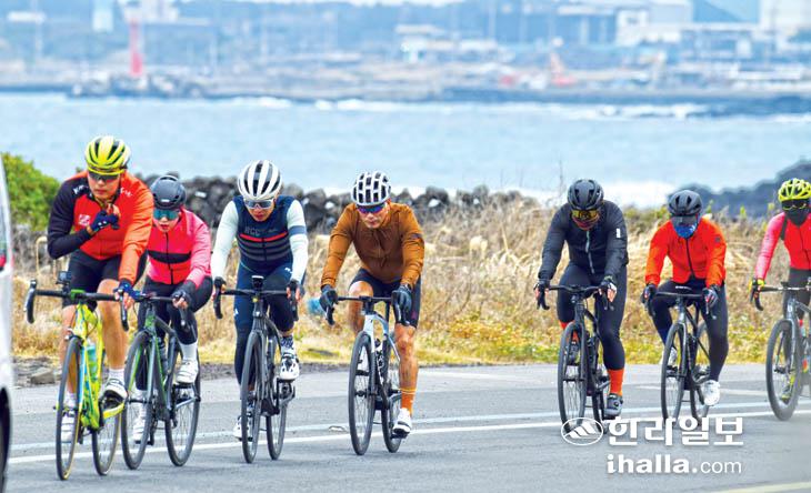 14일 제주시 구좌읍 해안도로에 라이더들이 가을바다를 한껏 느끼며 질주하고 있다. 강희만기자