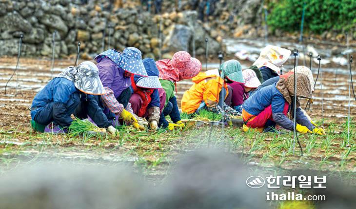 15일 제주시 조천읍 함덕리의 한 농경지에서 농민들이 양파모종 파종 작업을 하고 있다. 강희만기자