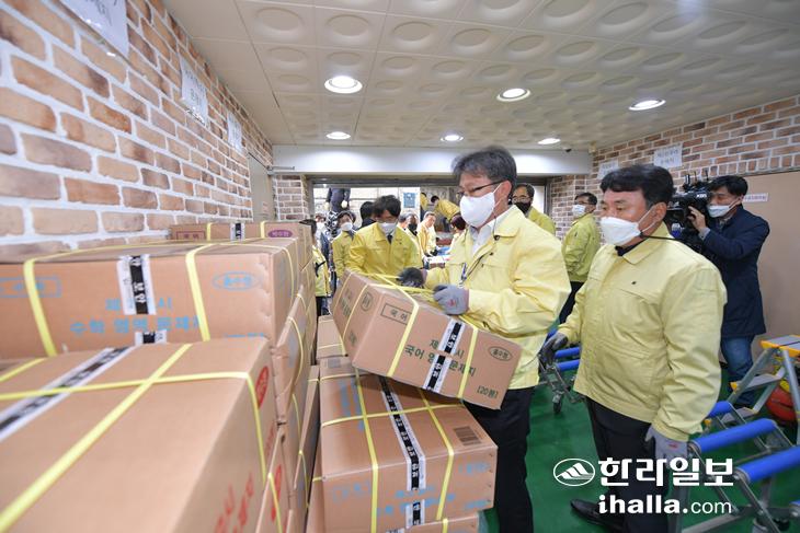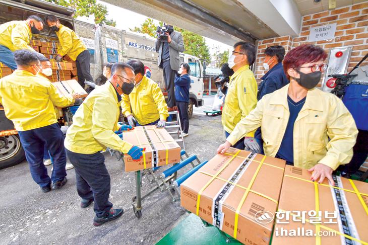 15일 오후 제주에 수능 문답지가 도착하자 관계자들이 컨테이너에서 하차하는 작업을 벌이고 있다. 이상국기자