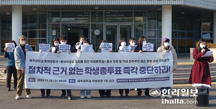 16일 제주대 총여학생회 폐지를 반대하는 공동대책위원회(이하 공대위)가 제주대 학생회관 앞에서 "학생회칙을 위반한 채 진행되는 투표를 거부한다"고 주장하는 내용의 기자회견을 하고 있다. 김도영 기자