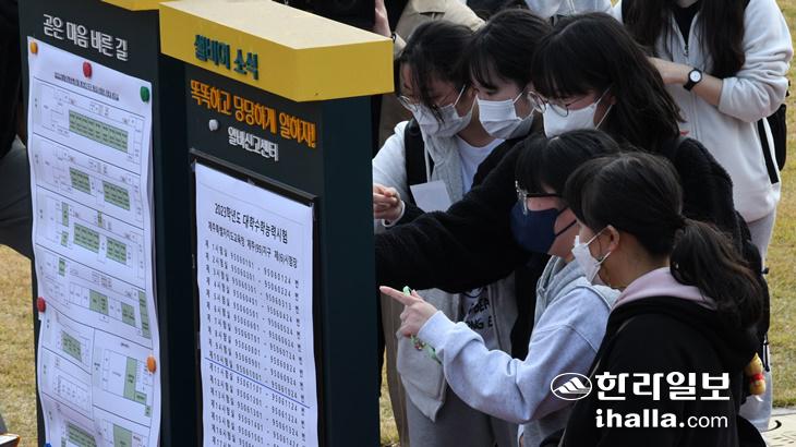 16일 오후 제주중앙여고에서 진행된 예비소집에 참가한 수능 수험생들이 시험장 위치를 확인하고 있다. 강희만기자