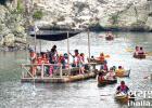 16일 서귀포시 쇠소깍을 찾은 관광객들이 전통테우와 카약을 타며 즐거운 시간을 보내고 있다. 이상국기자