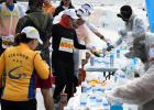 20일 제주시 조천운동장에 마련된 2022제주감귤국제마라톤대회 행사장. 빗 속에도 속속 모여드는 국내외 달림이들의 발걸음에 행사장은 생동감이 돌았다. 우비를 입거나 우산을 쓴 참가자들은 자신과의 싸움에 도전하기 위해 일찍감치 운동장에 도착해 번호표를 옷에 부착한 뒤 저마다의 방식으로 굳어진 몸을 풀며 빗속 레이스를 나설 준비에 집중하고 있었다. 이날 스포츠테이핑센터와 참살이적십자봉사회는 마라톤 중 다치는 것을 막기 위해 출발 전 달림이들의 테이핑을 도왔다.