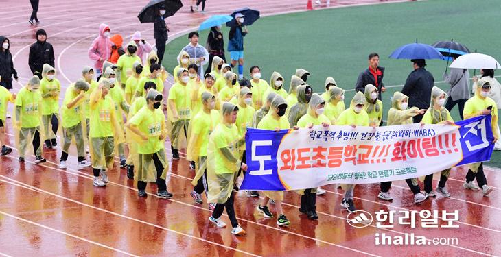 외도초 6학년 어린이들이 감귤마라톤 출전에 앞서 조천운동장을 돌며 학교 홍보와 함께 몸을 풀고 있다.