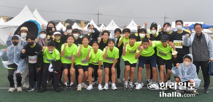 20일 조천운동장에서 열린 2022 제주감귤국제마라톤대회에 참가한 아라중학교 학생과 교사들이 파이팅을 외치고 있다. 이상국 기자