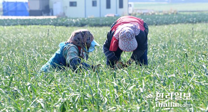 21일 제주시 한경면 고산리 한 밭에서 농민들이 잎마늘 수확을 앞두고 김매기 작업을 하고 있다. 이상국기자