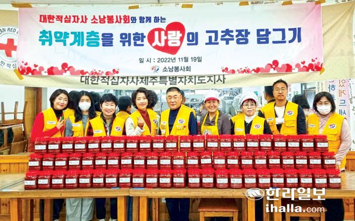 대한적십자사 소낭봉사회(회장 강창용)는 지난 19일 제주적십자사에서 봉사원 10여명이 참여한 가운데 정기후원 가구에 전달할 고추장 담그기 행사를 한 후 성인발달장애인 힐링센터와 신장장애인 활동센터, 정기후원 4가구 등에 고추장 및 생필품을 전달하고 격려했다.