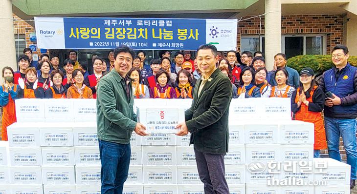 국제로타리3662지구 제주서부로타리클럽(회장 도평 김성하)은 지난 19일 김장김치 45포기를 초록우산 어린이재단 제주지역본부(본부장 박정숙)에 전달했다.