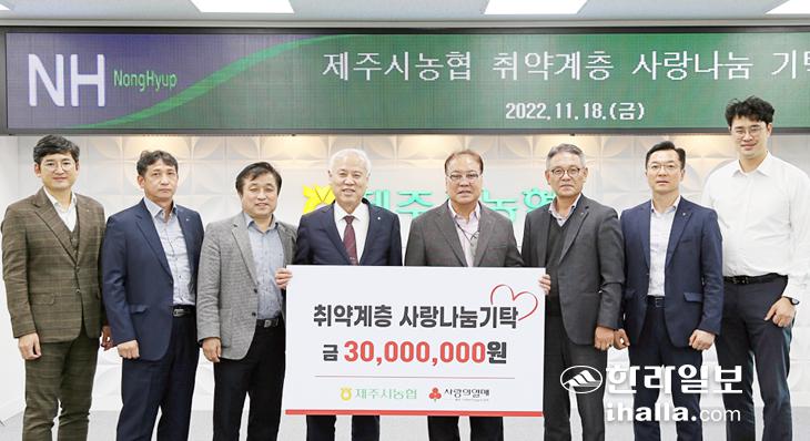 제주시농협(조합장 고봉주)은 지난 18일 제주시농협 회의실에서 사랑나눔성금 3000만원을 제주사회복지공동모금회 이철수 수석부회장에게 전달했다.