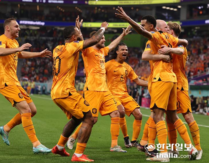 21일(현지시간) 카타르 알투마마 스타디움에서 열린 2022 카타르 월드컵 조별리그 A조 1차전 세네갈과 네덜란드 경기. 네덜란드의 첫골을 넣은 코디 학포가 동료들과 환호하고 있다. 연합뉴스