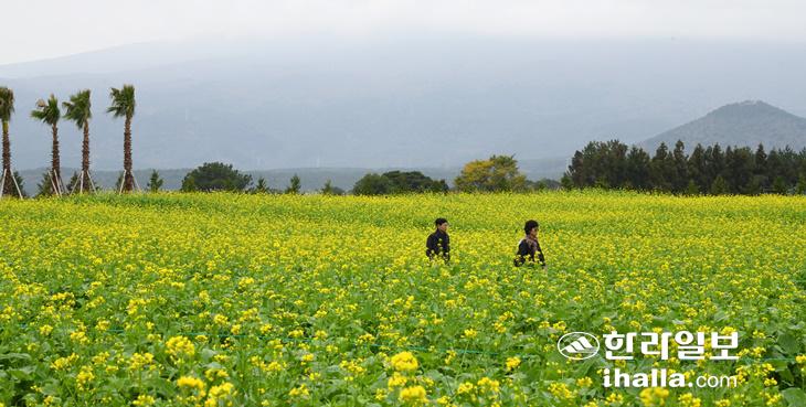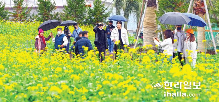 22일 서귀포시 남원읍 휴애리자연생활공원을 찾은 관광객들이 유채꽃밭에서 기념사진을 찍고있다. 이상국기자