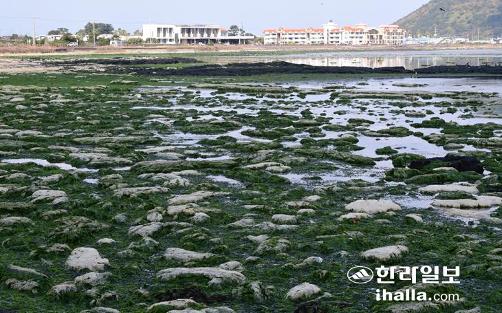 22일 서귀포시 성산읍 시흥리 해안가에 엄청난 양의 파래가 떠밀려와 악취와 함께 미관을 해치고 있다. 강희만기자
