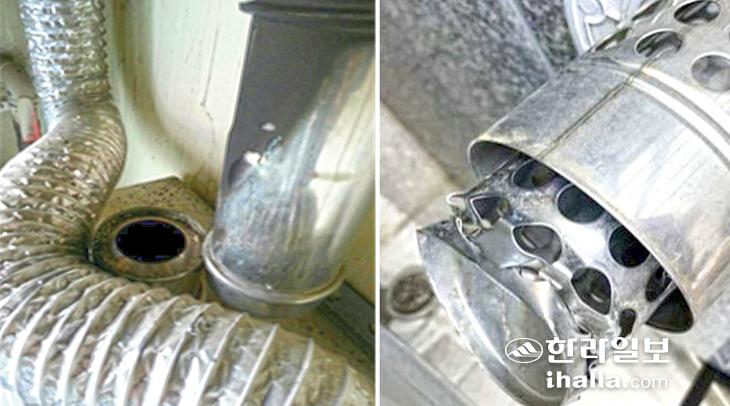 겨울철 난방을 위해 가스보일러를 가동하기 전 사고 예방을 위해 배기통이 빠져 있거나(사진 위쪽) 배기구가 찌그러진 곳이 있는지(아래쪽) 등을 점검하는 게 좋다. 한국가스안전공사 제주본부 제공