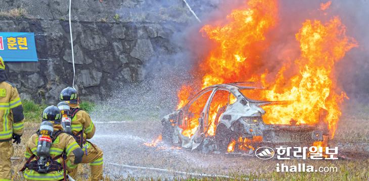 23일 제주시 한천 제1저류지에서 제주시소방센터 및 구조대, 신임 교육생 265명이 참석한 가운데 전기차 실물화재 교육훈련이 진행됐다. 이상국기자