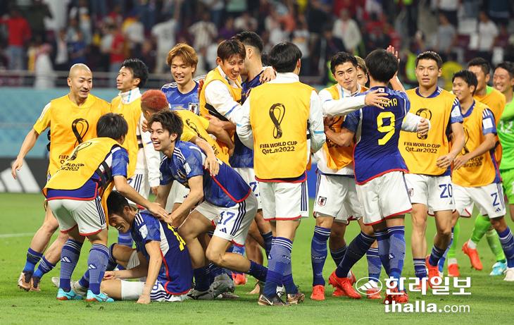 23일 오후(현지시간) 카타르 알라이얀의 할리파 인터내셔널 스타디움에서 열린 2022 카타르 월드컵 조별리그 E조 독일과 일본의 경기에서 2-1 역전승을 거둔 일본 선수들이 기뻐하며 그라운드로 뛰어들고 있다. 연합뉴스