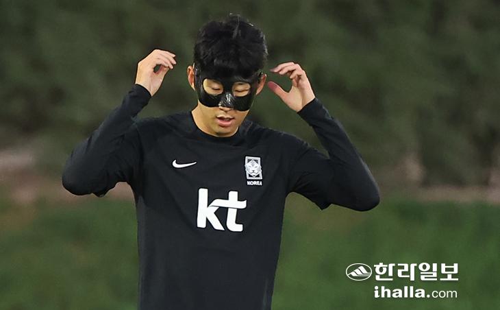 2022 카타르 월드컵 대표팀 손흥민이 22일(현지시간) 카타르 도하 알에글라 훈련장에서 훈련 전 마스크를 착용하고 있다. 연합뉴스
