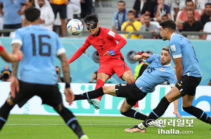 24일 오후(현지시간) 카타르 알라이얀의 에듀케이션 시티 스타디움에서 열린 2022 카타르 월드컵 조별리그 H조 1차전 대한민국과 우루과이 경기. 손흥민이 우루과이 페데리코 발베르데(15)를 제친 뒤 황의조를 향해 크로스를 올리고 있다. 연합뉴스