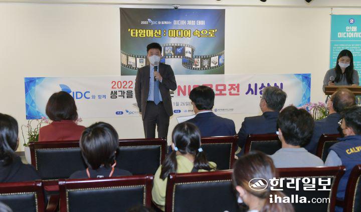 26일 한라일보 1층 갤러리ED에서 열린 '2022 JDC와 함께하는 미디어 체험 데이' 오프님을 겸한 '2022 JDC와 함께 생각을 춤추게하는 NIE 공모전 시상식'에서 인사말을 하고 있는 한라일보 이윤형 편집국장. 이상국기자
