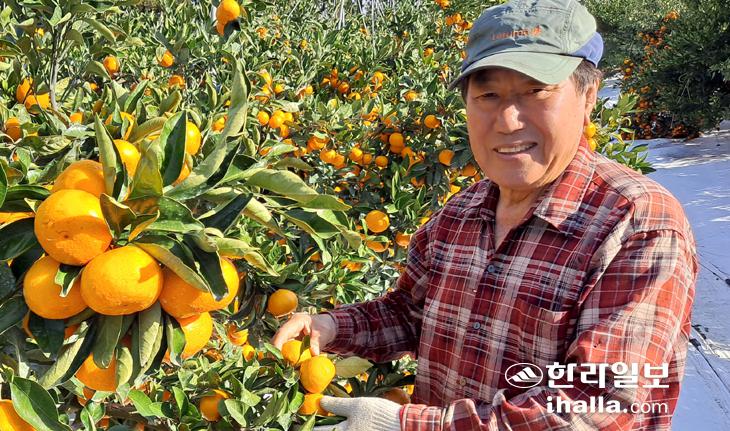 서귀포수(秀)농원 강경수 대표가 서귀포시 도순동 소재 자신의 감귤원에서 타이벡 재배한 노지감귤에 대해 설명하고 있다.
