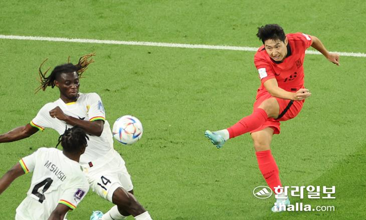 28일 오후(현지시간) 카타르 알라이얀의 에듀케이션 시티 스타디움에서 열린 2022 카타르 월드컵 조별리그 H조 2차전 대한민국과 가나의 경기. 한국 이강인이 슛을 날리고 있다. 연합뉴스
