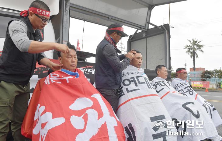 정부가 29일 화물연대 총파업에 대해 첫 업무개시명령을 발동하자 민주노총 공공운수노조 화물연대 제주지부 관계자들이 제주시 제주항 6부두 앞 도로에서 업무개시명령을 규탄하며 삭발하고 있다. 이상국기자