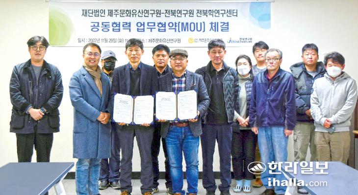 (재)제주문화유산연구원(원장 고재원)과 전북연구원 전북학연구센터(센터장 김동영)는 29일 제주문화유산연구원 세미나실에서 연구협력 협약을 맺었다. 두 기관은 앞으로 제주학 및 전북지역학 발전에 기여할 수 있는 공동 연구 수행 등에 협력해 나간다.